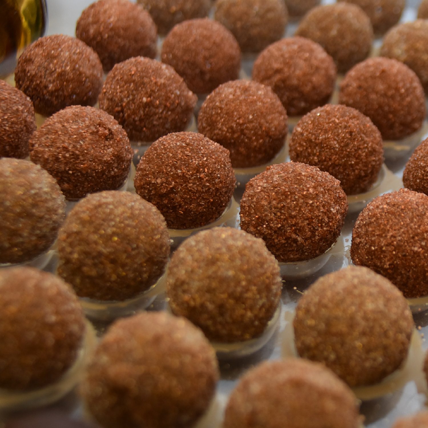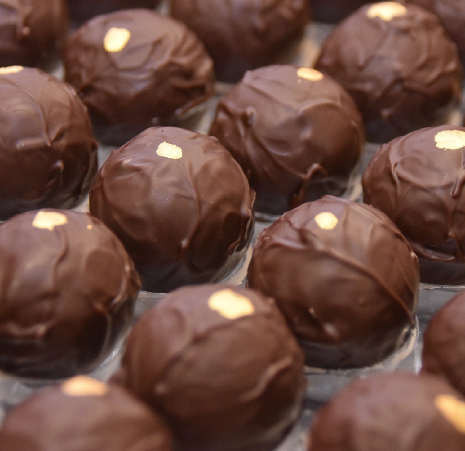 Eine zartcremige Truffes Ganache und weichem Kern aus Caramel, aromatisiert mit Gonzen-Marc, sowie eine Variante mit flüssigem Kern.
